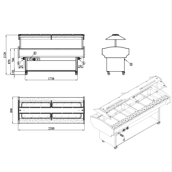 Granite top,Illuminated canopy,Refrigerated well has drain & drain tap,Castors as standard with 2 braked,Gastronorm containers up to maximum 150mm deep not supplied,
