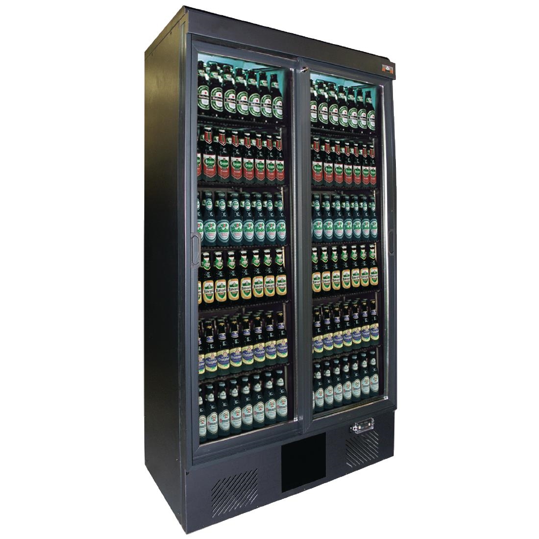Attractive, large capacity upright cooler with finned evaporators providing quick pull down for faster cooling. Double sliding doors are lockable for added security. Electronic thermostat and auto-defrost. Adjustable feet allow level positioning on uneven floors. Sliding door option ideal for establishments with limited space.
