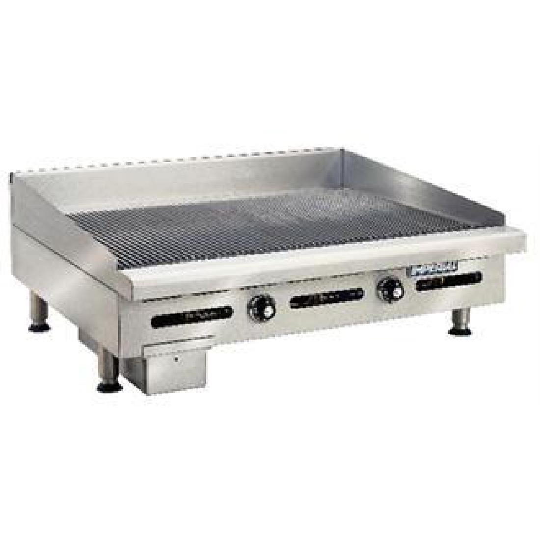 Thermostat controlled propane gas griddle by Imperial, designed to allow effective heat flow across the surface and maintain temperatures throughout cooking. Featuring; 0.5 inch thick ribbed plate with 610mm deep surface area, side and rear splashback with a removable grease trough for easy cleaning.